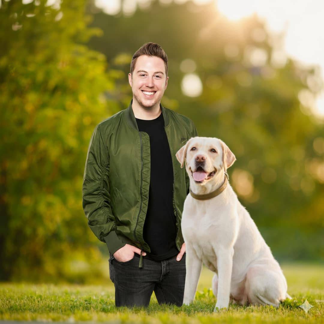 Prompt: "Combine the dog and man in these photos into a single portrait, where both are together outside."
